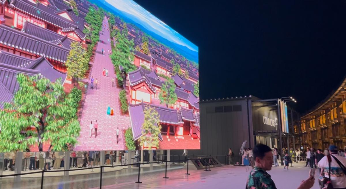 落選続きの中ついに夕刻7時予約に当選!夕刻7時の予約なし列が凄い状況になっていました。日本館の入口は、通路の邪魔にならないように壁に沿って入場者がろくろを巻くように並びます。その内側を予約者が入口に向かって歩きます。入口はどこなのかと思われるほど遠く感じますが360度パノラマロケーションなのでそれなりに楽しめます。また、通路の所々にミストが設置されており暑さ対策も考慮されています。QRコードで説明を聞くことが出来るので帰宅後も展示内容を深堀することが出来ます。